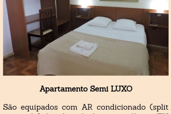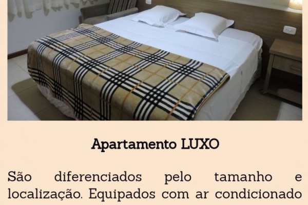 Hoje dispomos de 37 apartamentos divididos em categorias que vão do STANDARD ao LUXO, satisfazendo com conforto e qualidade nossos hóspedes que aqui chegam a trabalho ou a lazer!